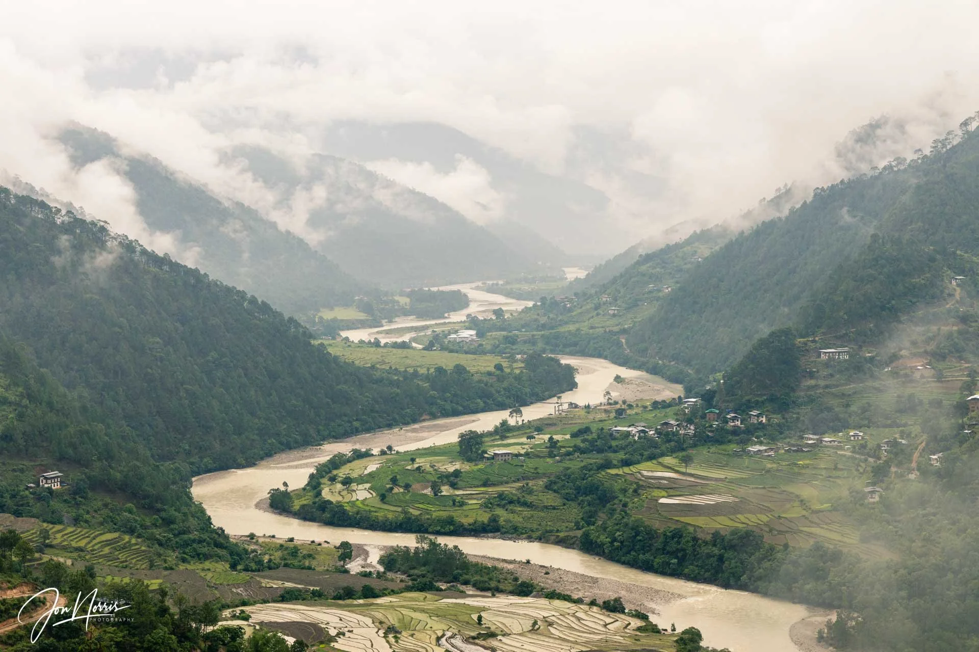 Mo Chhu river valley and rice fields, Punakha, Bhutan | © 2019 Jon Norris