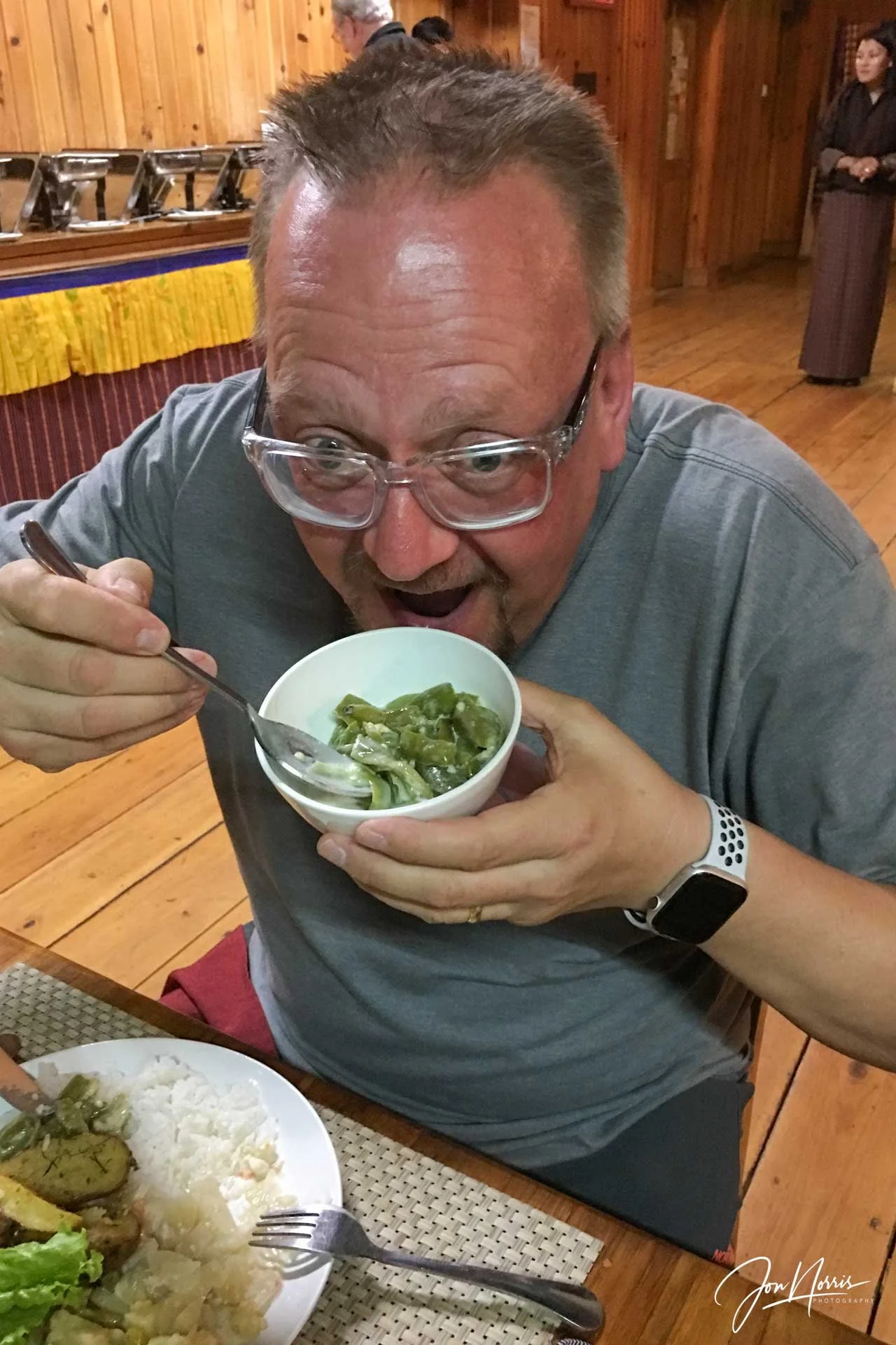 After a long day of hiking I was more than ready for dinner at our hotel. This last photo is of me tucking into a bowl of chili cheese (Ema datshi).