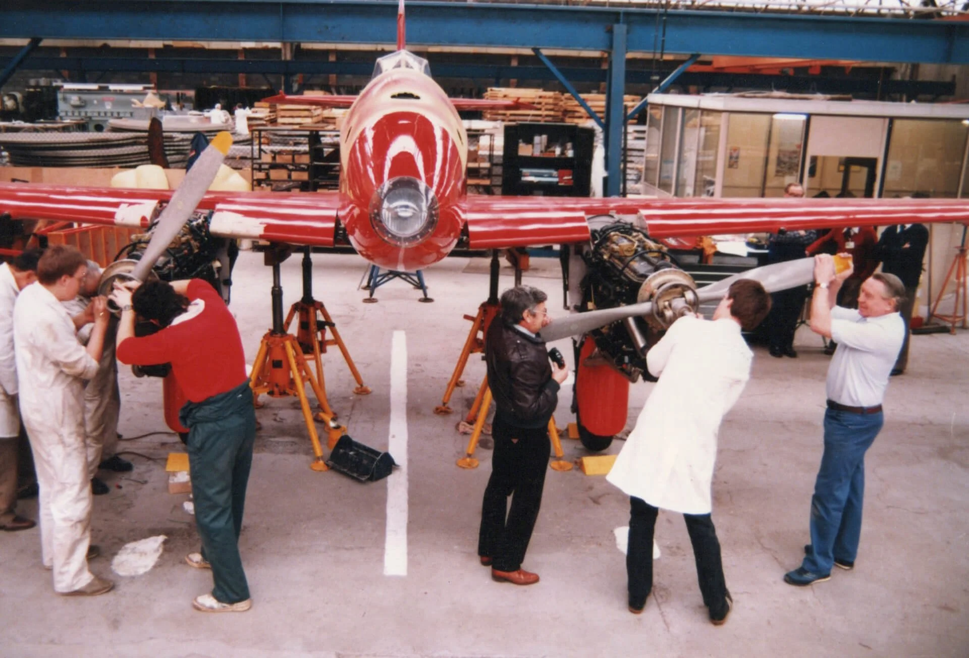 The original DH-88 Comet Racer at BAe Hatfield in early 1987 | That’s me on the left of the photo, with another apprentice (Paul) wire locking the propeller attachment bolts in place