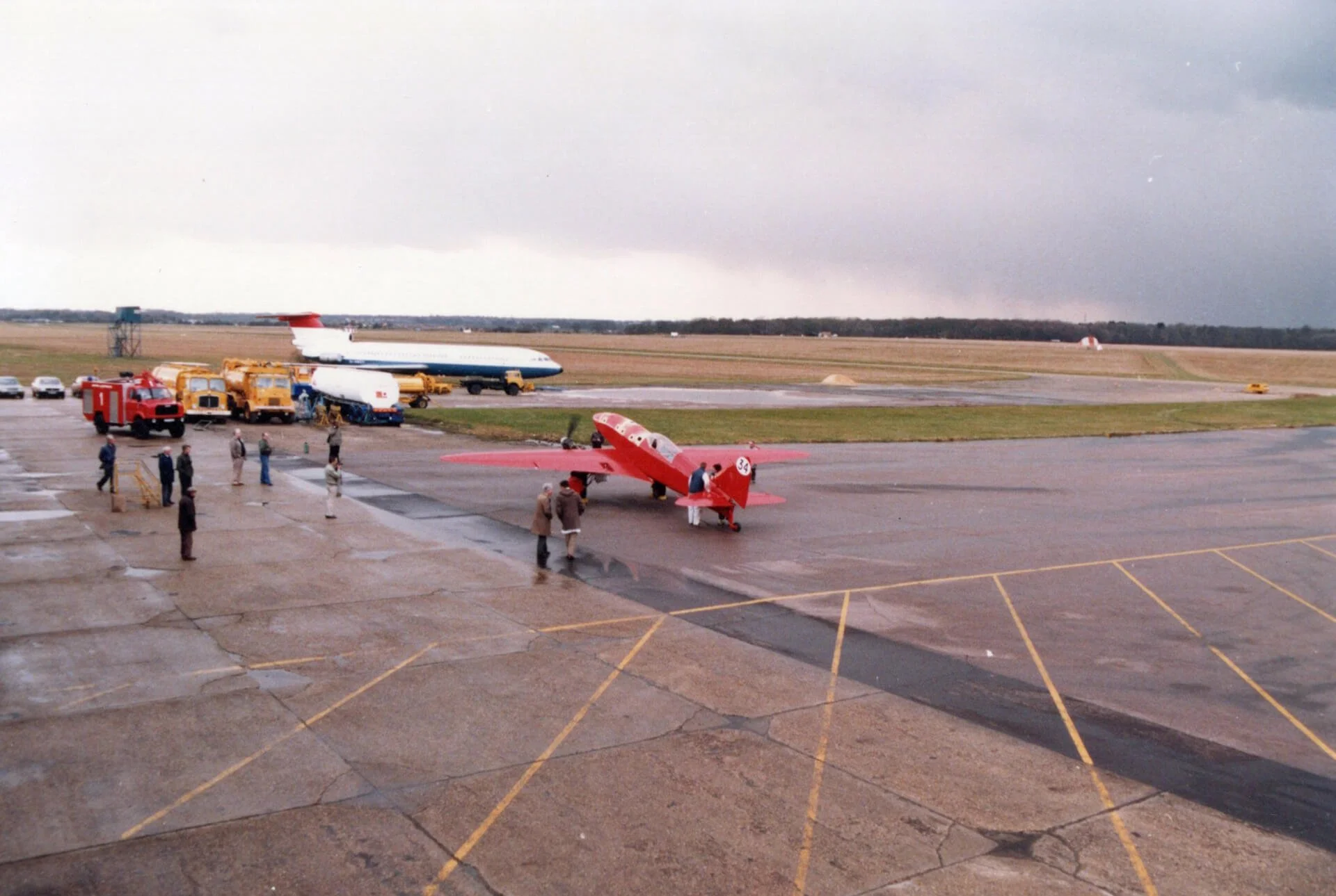 The original DH-88 Comet Racer at BAe Hatfield |28 March 1987 | Some of the rebuild team (and a firetruck) look on during a break from the engine runs
