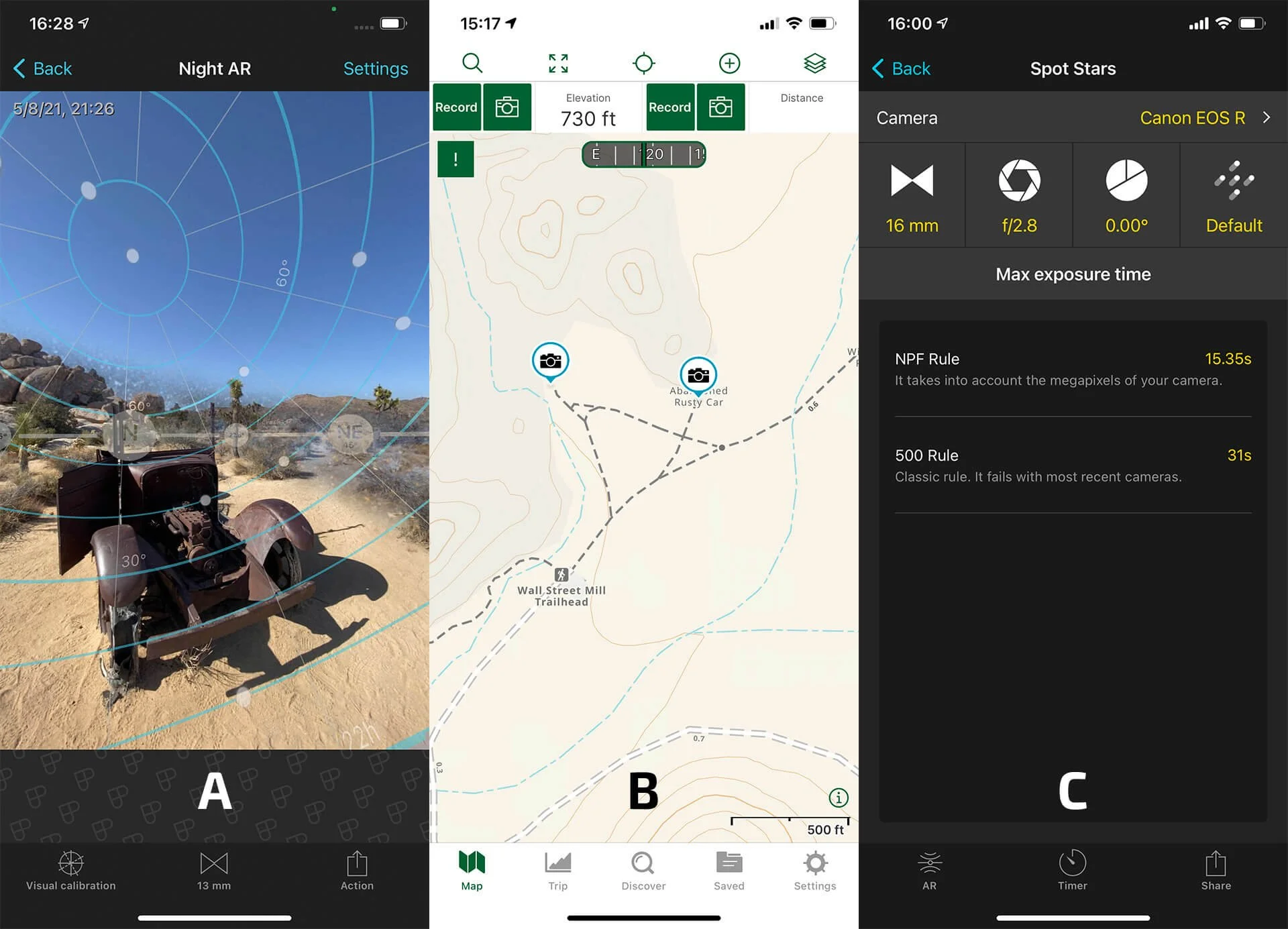 (A) Locating Polaris and pre-visualizing my composition with PhotoPills | (B) Dropping a pin on my GAIA GPS map so I could find my way back to the location in the dark | (C) Dialing in the correct camera settings to ensure sharp spot stars with PhotoPills