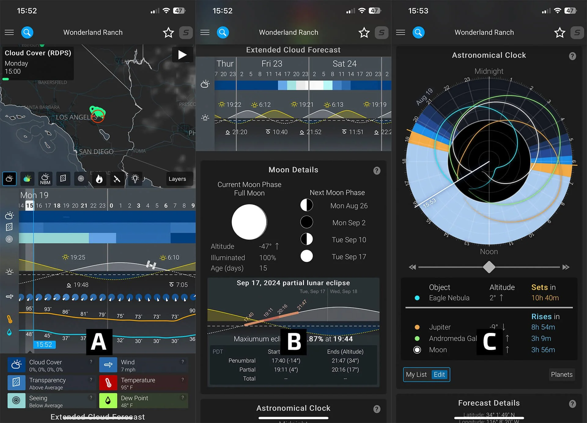 (A) Astropheric map, cloud cover, transparency, seeing, wind, temperature, and dew point | (B) Extended cloud forecast, moon details, and eclipse | (C) Astronomical clock and celestial objects