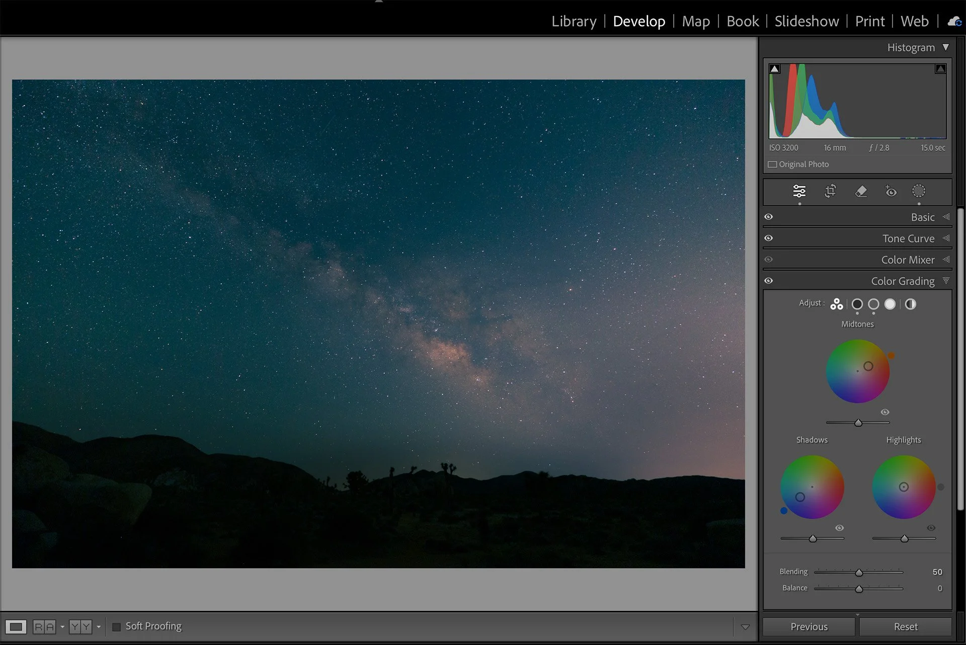 It’s time to introduce some color into the shadows and highlights. To do this, use the Color Grading panel. I like to make the shadows more blue and the highlights more orange. However, rather than the Highlights color wheel, I use the Midtones wheel instead to reduce targeting only the brightest stars.