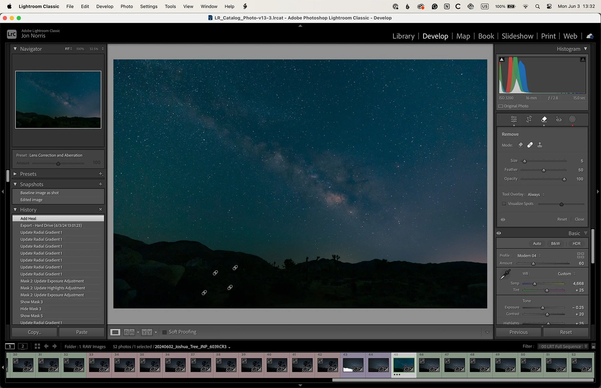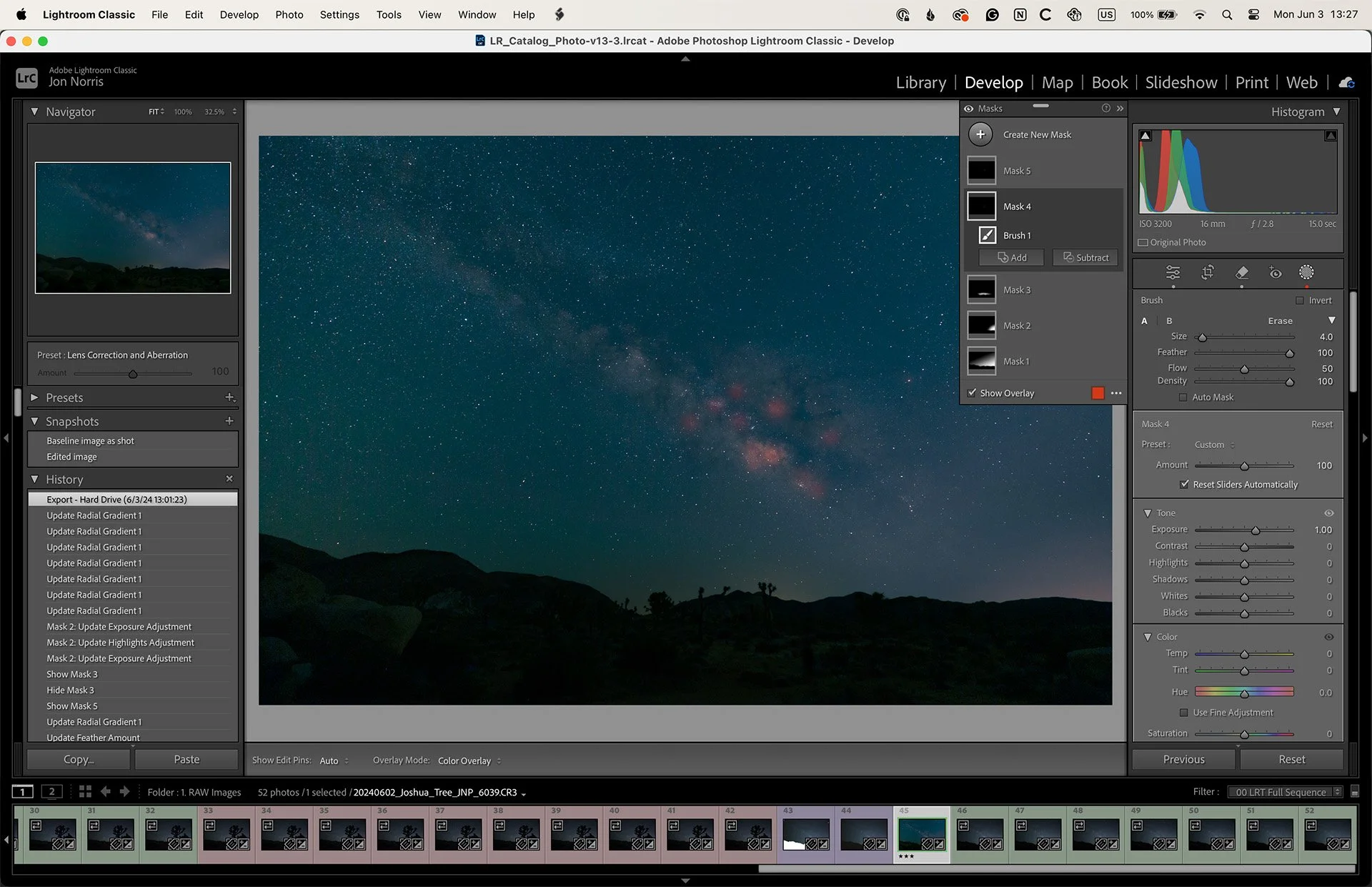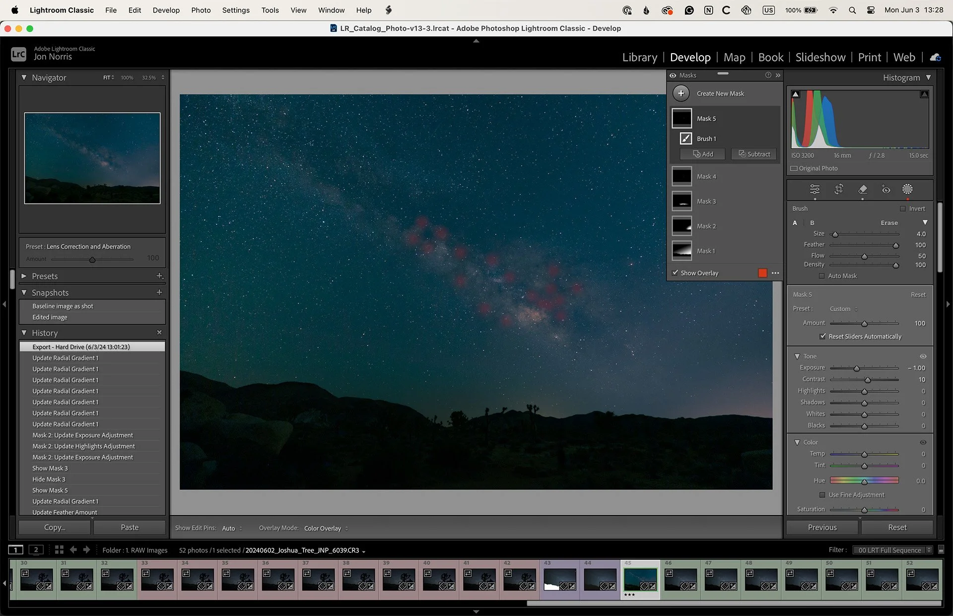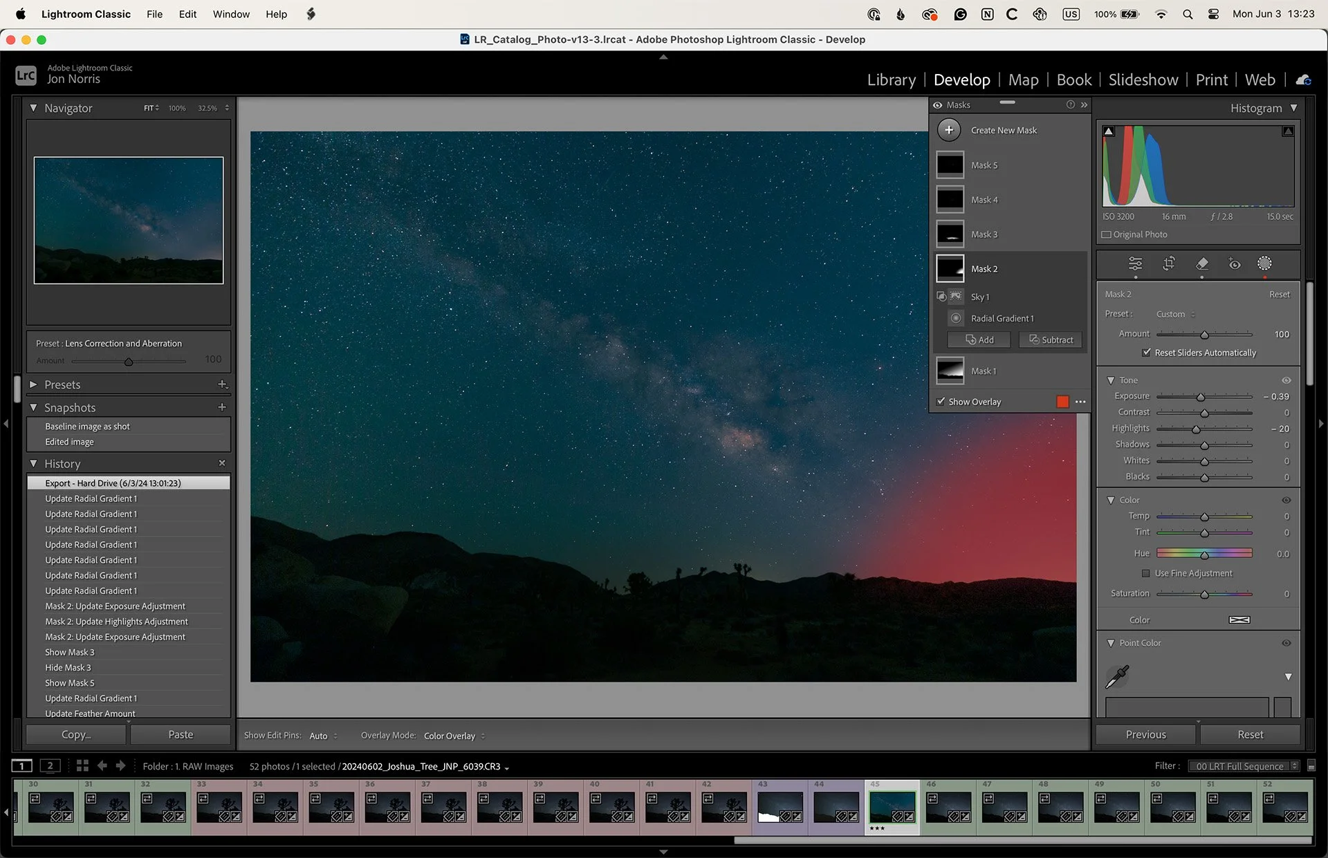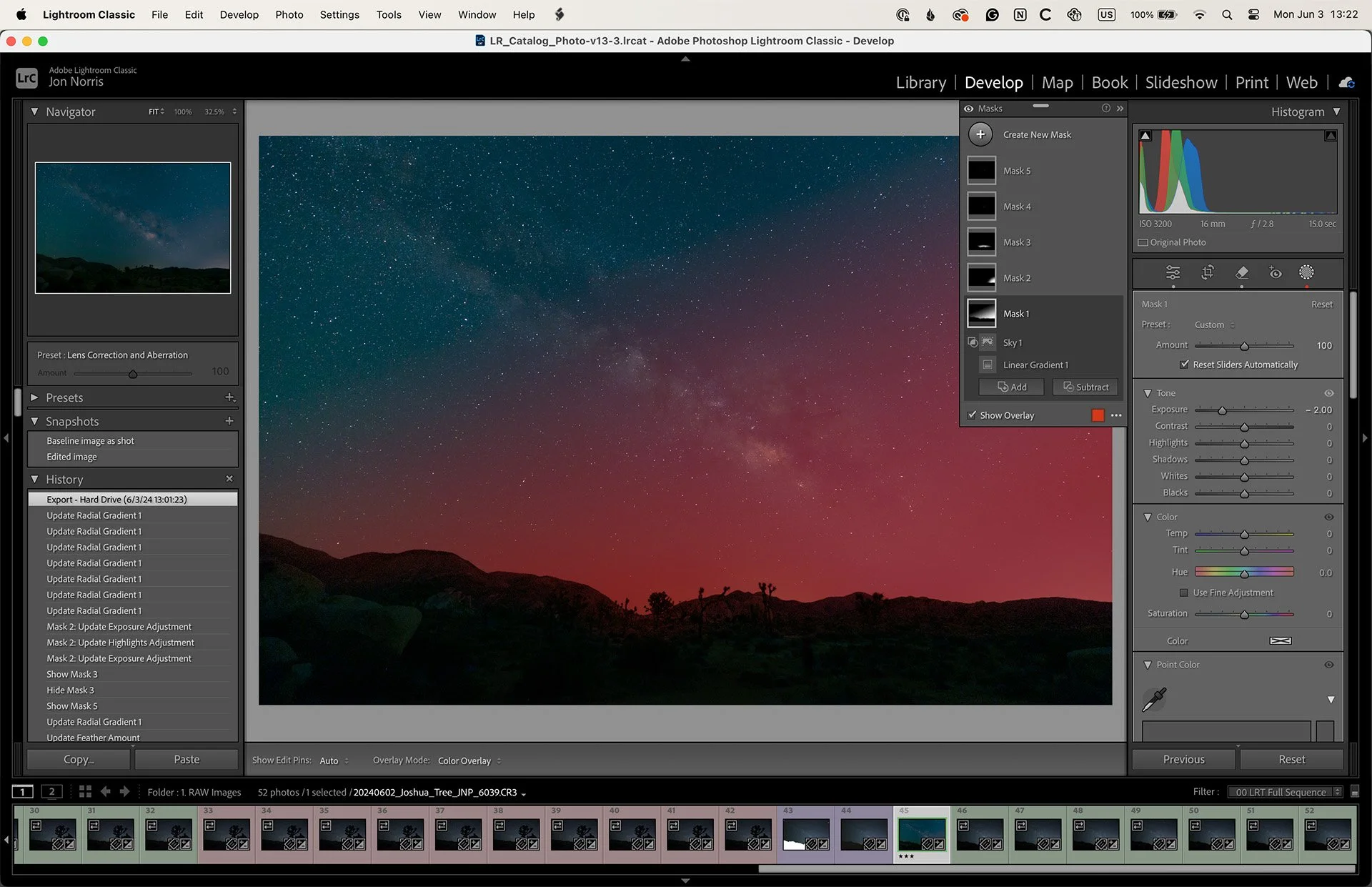 I needed to reduce the orange/yellow light pollution on the horizon, so I added a graduated filter by dragging it from the bottom of the image to approximately halfway up the sky. As the bottom right-hand corner of the scene was very bright due to light pollution (thanks, Coachella Valley), I rotated the filter to darken that corner. You can see the red overlay that shows how the filter is positioned/rotated.