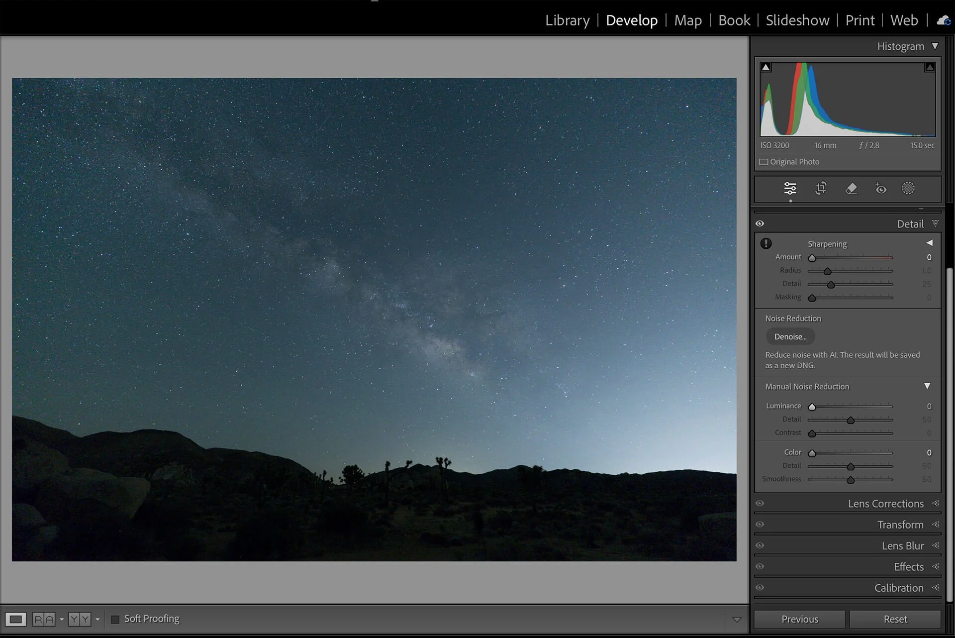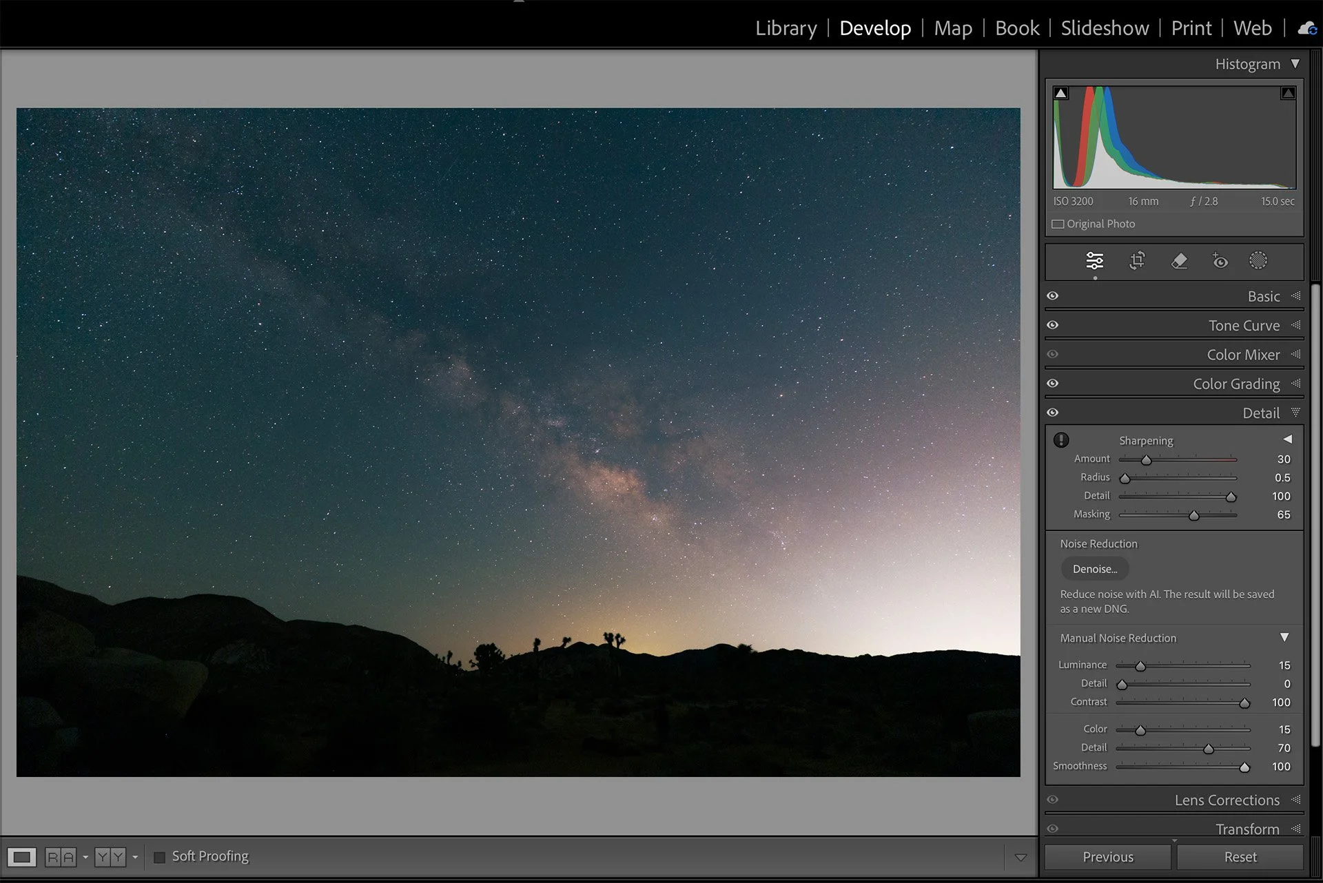 I recommend not using the default Lightroom color noise reduction settings on your Milky Way images. These settings can remove the color around stars while removing color noise, which is why we turned them off in step 2. We will add some sharpening and noise reduction but retain those colorful stars without excess color noise.