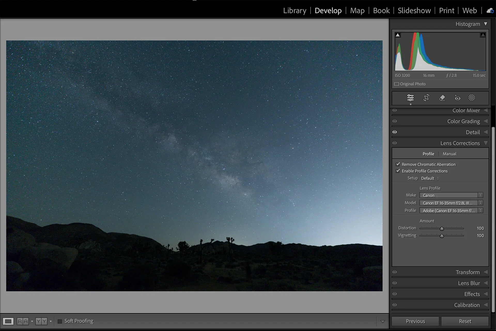 Open your Milky Way RAW image, and in the Basic Panel, set the Profile to Adobe Standard v2. For now, turn off the Detail panel's sharpening and noise reduction (luminance and color). Select Remove Chromatic Aberration and Enable Profile Corrections in the Lens Correction panel.
