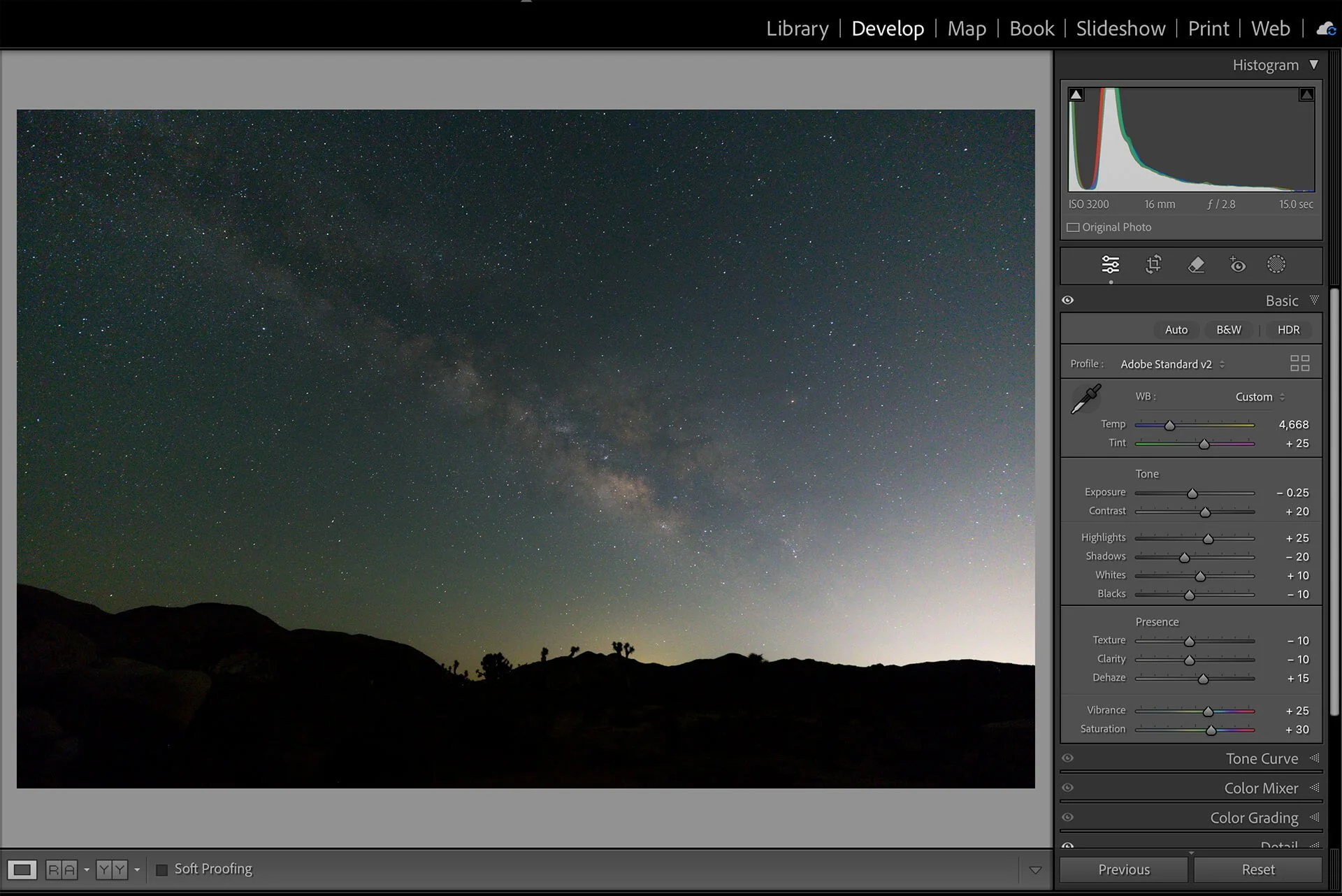 The Highlights slider in the Tone Curve panel is a fine edit that only affects the brightest stars. To keep that refined feel, I like to decrease it slightly (-10 to -15).