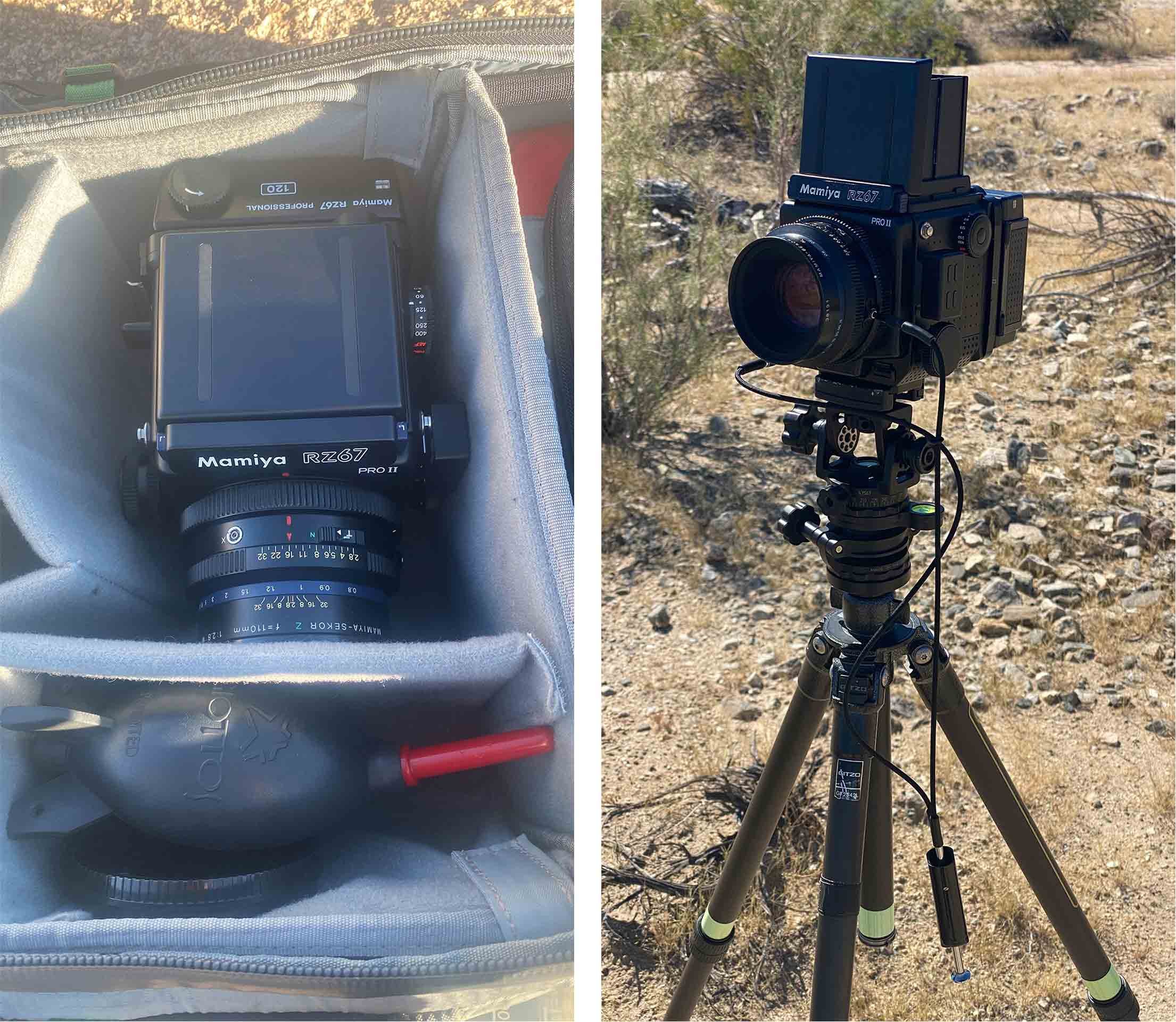 (Left) The Mamiya RZ67 Pro II taking up most of the room in my camera backpack | (Right) Setup and ready to take my first image | © 2025 Jon Norris