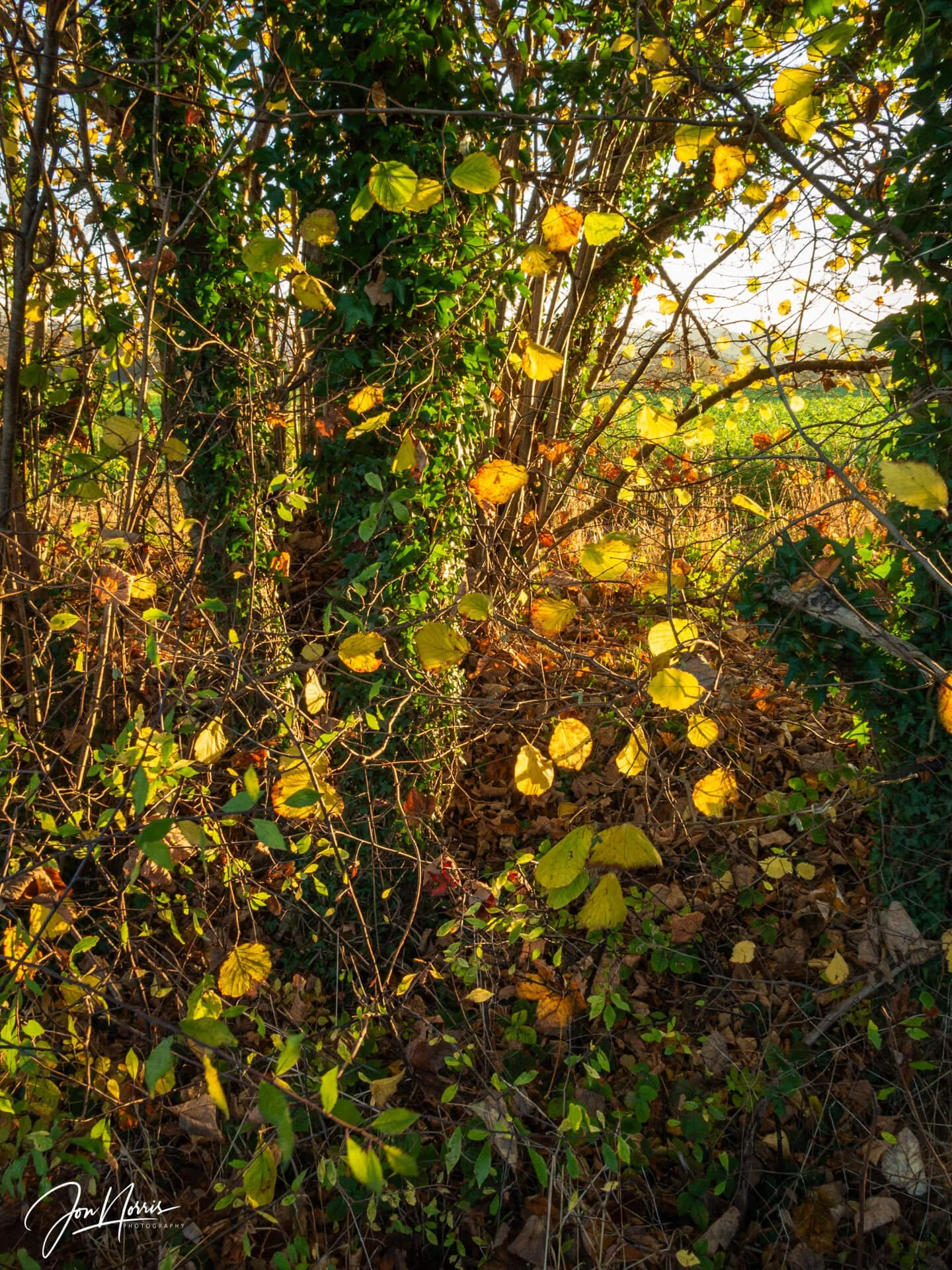The hedgerow I was walking alongside was patchy in places, and occasionally, a window of warm light highlighted the autumnal-colored leaves. This caught my eye and stopped me in my tracks.
