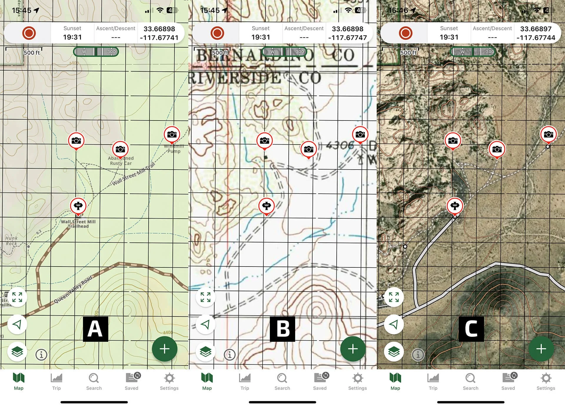 Gaia GPS screen shots showing different map layers | © 2025 Jon Norris
