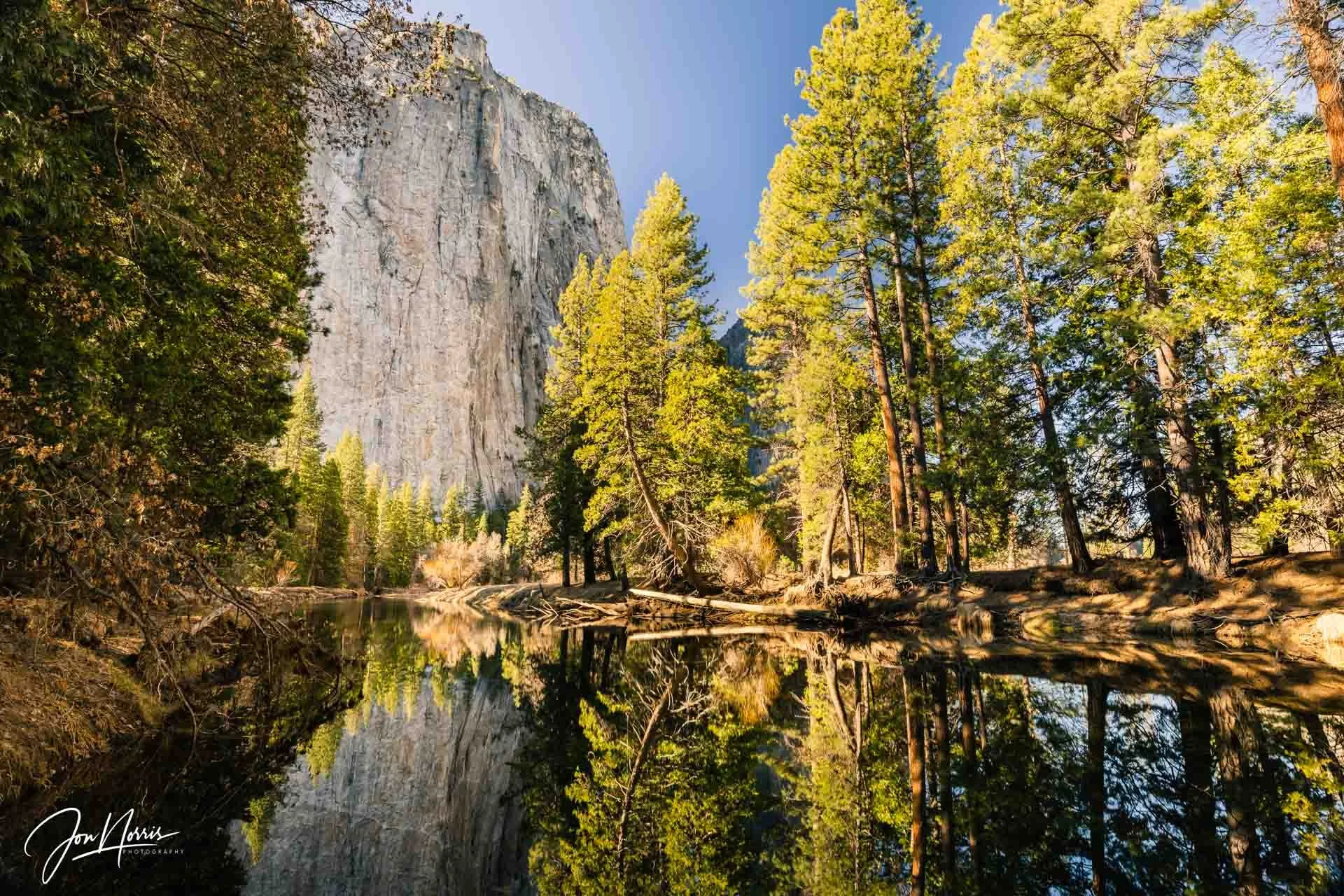 Mirror-like reflection of Cathedral Rocks in the Merced River