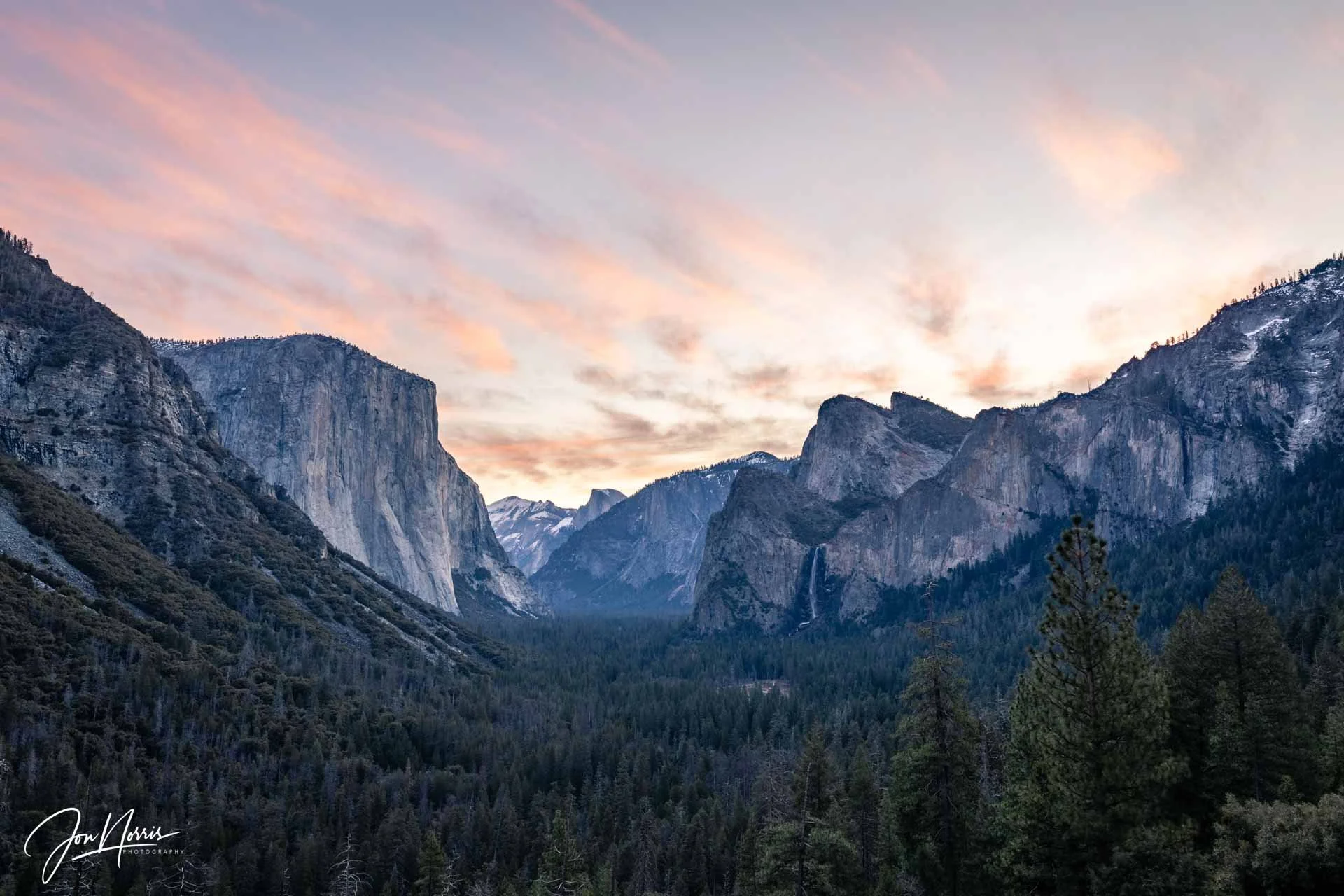 Sunrise over El Capitan, Half Dome, Cathedral Rocks, and Bridalveil Falls from Tunnel View. One of the most incredible views of Yosemite National Park.