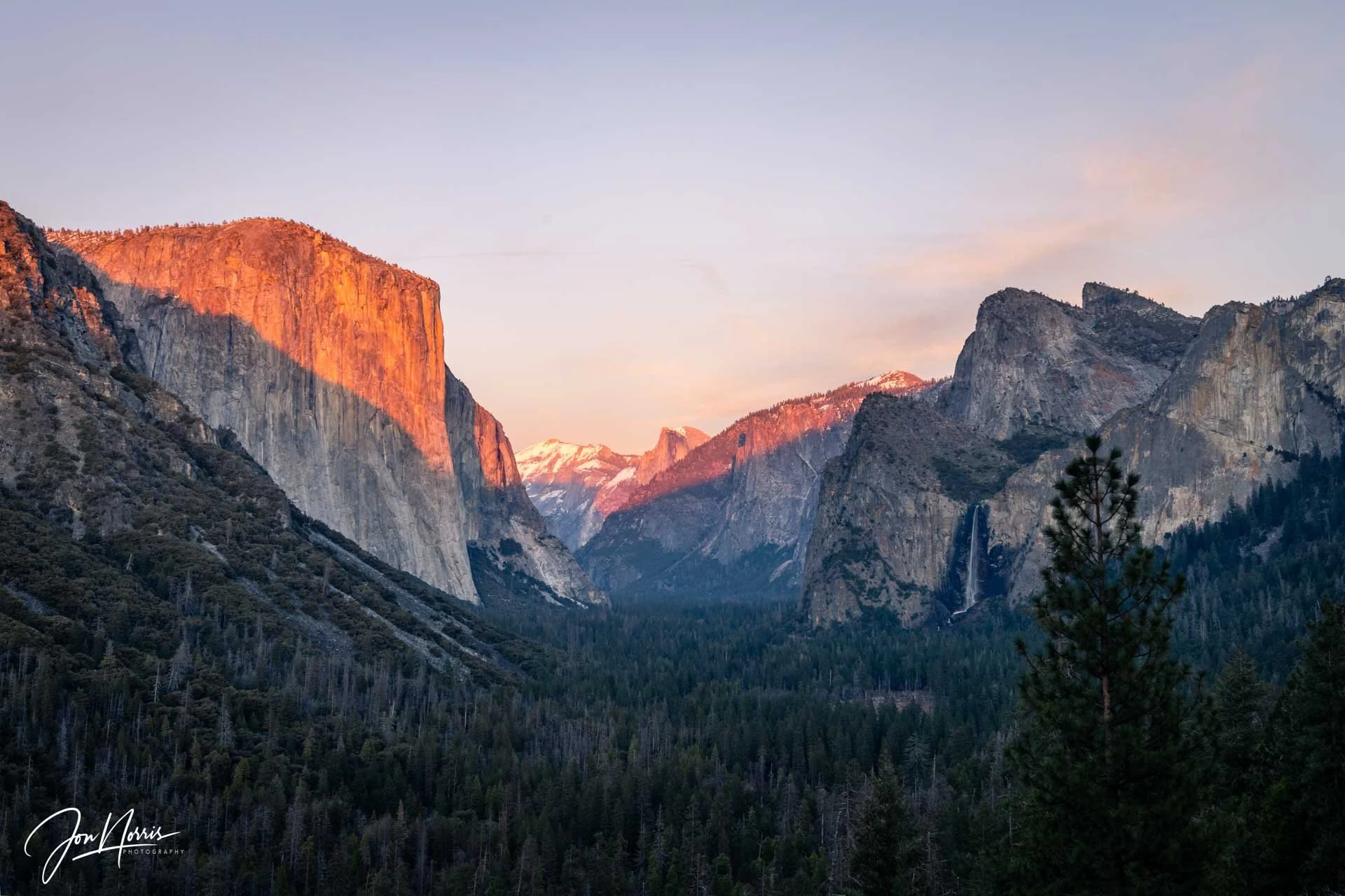The last of the light as the sun sets over El Capitan, Half Dome, Cathedral Rocks, and Bridalveil Falls from Tunnel View.